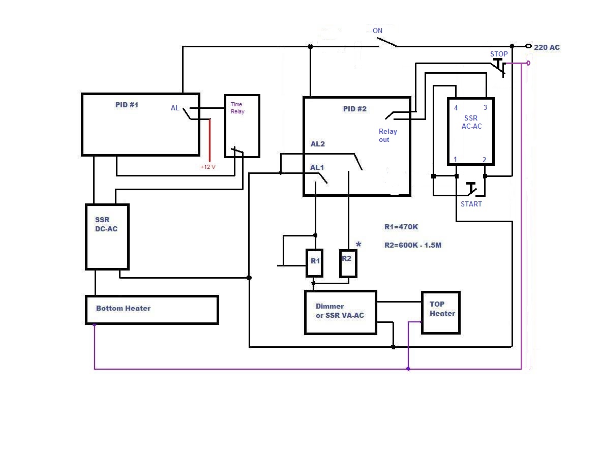 Доработал свою паялку по методу Krievs на пидах. Добавил контроль напряжения на верхнем нагревателе. Принудительное включение низа , верха на 1 ступени (аларме) (100-200град.) + регулятор напряжения верха для 1 ступени. (в моей паялке на 2 ступени 200-230град. на верх подается все сетевое напряжение). Также понизил напряжение включение 1 ступени верха до 100град.