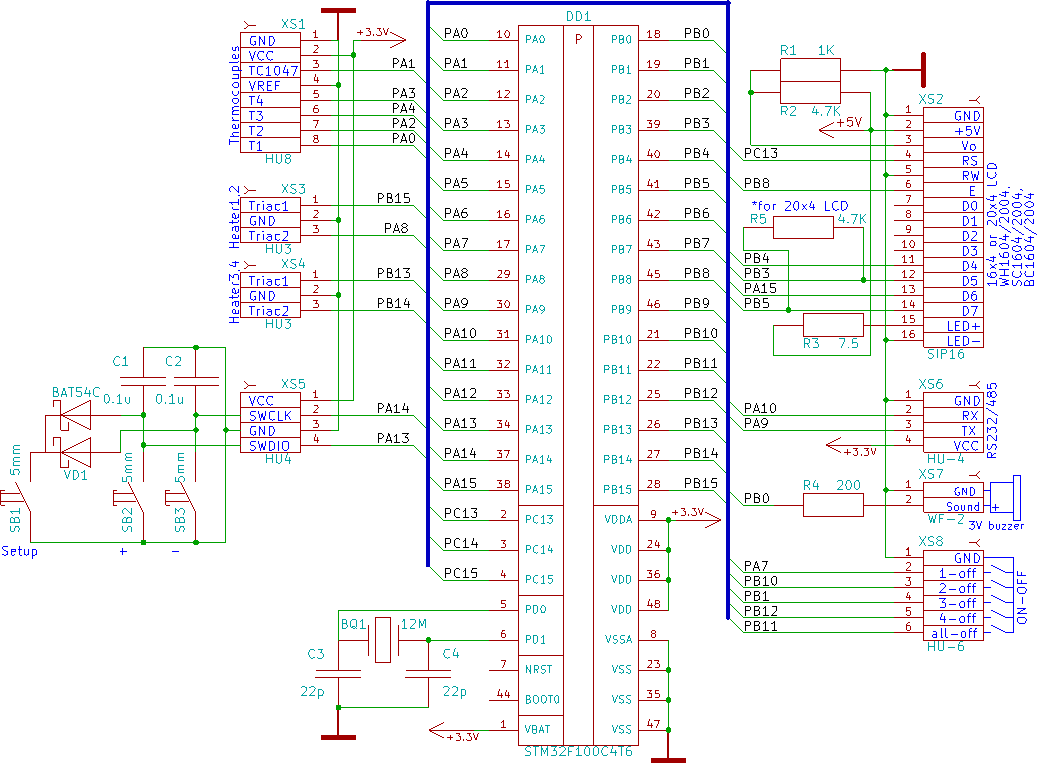 Нормальная схема, тоже усилители аналог стоят. Коррекция dT1 - dT4 для термопар позволяет в широких пределах подогнать, если есть необходимость. Есть недостаток с просадкой сети, когда включаются нижние нагреватели, у меня 2,4 кВт. Но и тут есть выход.  |