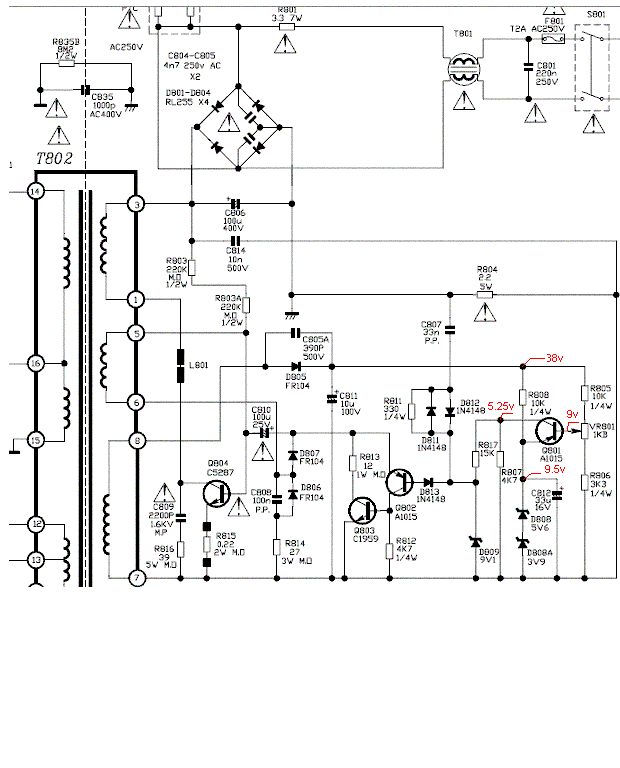 Думаю есть связь с ИБП (схему этой части прилагаю), проверил по сервис мануалу все указанные напряжения - норма, начал мерять на стабилитронах, подозрение на транзистор Q801 (хотя не звонится), измерял все мультиметром, подскажите, кто сможет, куда двигаться.