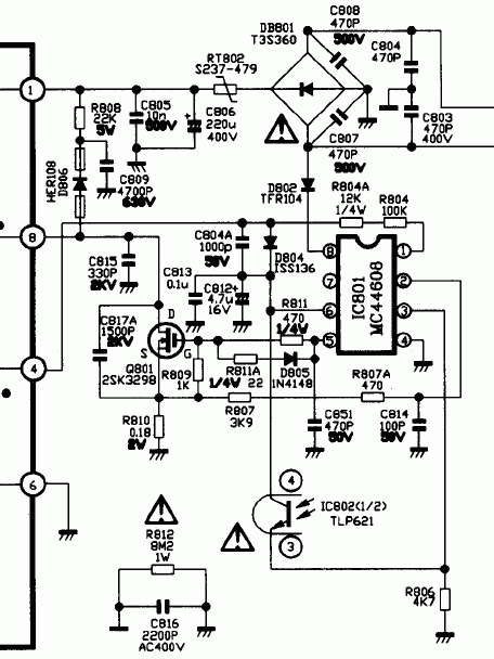 | Тв SHIVAKI STV1479. Попала вода на первичную часть ибп, сгорели полевик K2996, м.схема MC44608, R811a(22om) R811(470om), R807a(470om), D804(iss136), D805(1n4148), R807(3.9ком), R810(0.22om). Детали поменял......при включении Тв запустился на несколько секунд, светодиод погас и развёртка начала щёлкать с интервалом 1 секунда......между щелчками высокое появляется. Диодный мост и его обвязку проверил - всё в порядке....нужен ваш совет. |