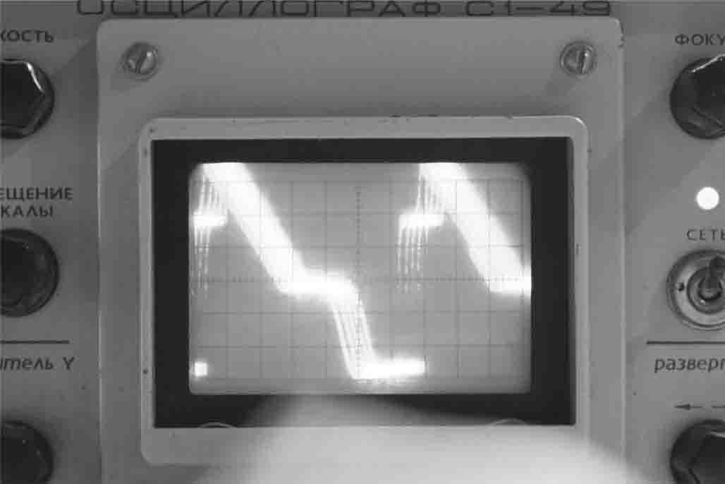 А вот на 1 ноге, куда должен приходить инверсный сигнал с проца было такое безобразие ( фото 4 ),но когда поднял R314 (разорвал связь кадровой и проца по инверсному входу) ,то с выхода поца увидел красивую инверсную пилу.