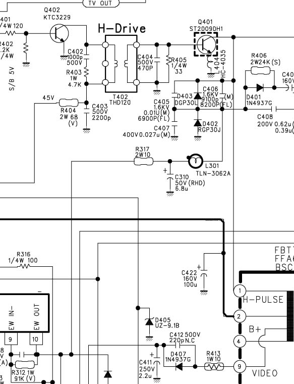 Строчке не даёт запуститься отсутствие питания +45В на ТМС, которое поступает через ключ Q513 и Q512.Управление ключом - 6pin проца( Hor.SW ) .Смотреть рис1.На 6pin проца постоянно 5В,после R501 0,7В.Если посадить на корпус 6pin проца,то питание на ТМС подаётся +43В и на базе НОТ Q401 тогда ССИ держатся около 2х секунд.