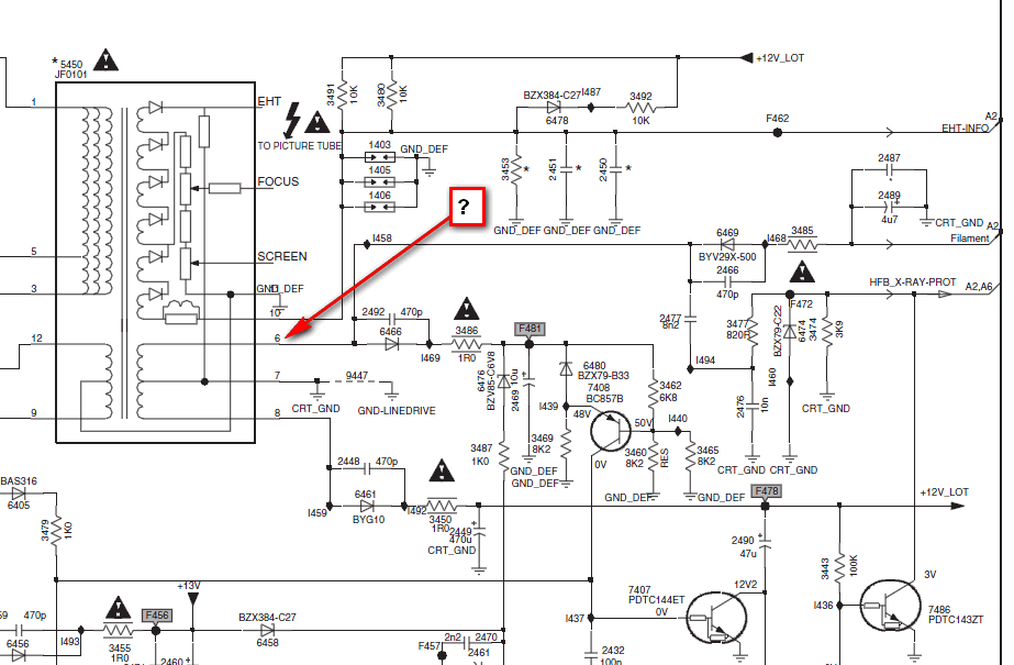на 6ом выводе ТДКС должно быть напряжение 70 вольт в положительной полярности (уроды, додумались же сделать накальную обмотку на 70вольт). Наверняка, кем то сжигался накал у кинескопа в этой модели. Правда там по цепи обрывник стоит, но это не всегда спасает. |