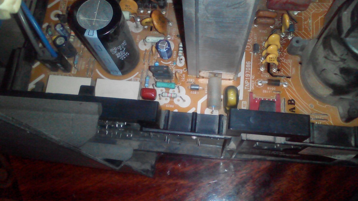 В этом телевизоре основная плата вставляется в пластмасовое шасси на котором сбоку плата блока питания, и основная плата вставляется разъемами в блок питания на фотках посмотрите, доступа к нижней части платы, практически нет. И похоже я локализовал точку где неисправность, это реле, обвел его красным! Когда экран потух я совсем легонько по нему щелкнул отверткой и экран засветился, но я это буду проверять еще.