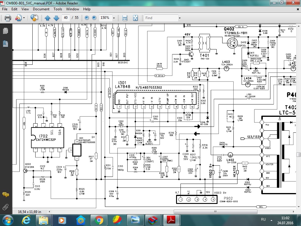 но подвижки вроде появились, при проверке обвязки кадровой я заметил отсутствие резистора R322 и в отчаянье впаял его, так же закоротил на корпус 10 вывод кадровой микросхемы, напряжение на пятой ноге снизилось до приемлемого значения, но на экране по прежнему узкая горизонтальная полоса