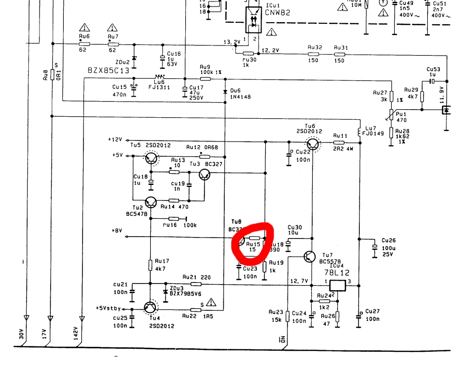 Говорю сразу,я начинающий в ЭЛТ)))),принесли с не включением,сгорел предохранитель,прозвонил БП,в кз мосфет IRFBC40 - заменил,проверил ёмкостя,ничего подозрительного,еще был потемневший резистор RU15,кто то его уже менял,и он был вместо 15оМ,45оМ,поменял и его,пробовал запустить через лампу,запустился только с 300вт лампой,НО заметил что после ~5мин. роботы лампа медленно какбы раскаляеться а потом тухнет,и выключаеться,тогда поставил предохранитель но такого же не нашел(был 1.6 поставил 2а),теперь вроде работает в норме