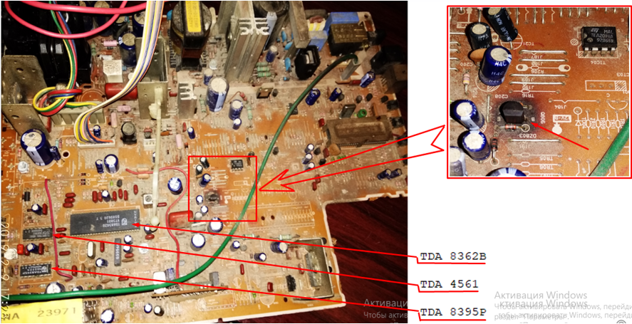 Схему скачал, но качество плохое, не вижу где какие напряжения нужно мерять. Внешний осмотр платы внимательно осмотрел под лупу на наличие "холодной пайки", все что было подозрителько пропаял. Электролиты в блоке питания и вокруг процессора, а так же возле ВЧ-входа и разъема скарта проверил (было несколько подсевших заменил на новые). В одном месте (на фото показал) грелся транзистор С2331, выпаял проверил звонится как годный (впаял назад), возле него проверил так же диоды.