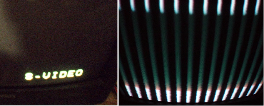 По теме: изображение неисравности. Срыв изображения. Слева - телевизор до проявления неполадки. Включён в режиме S-Video. Чёрный экран. Справа - произошёл срыв изображения, режим работы по-прежнему S-Video.
