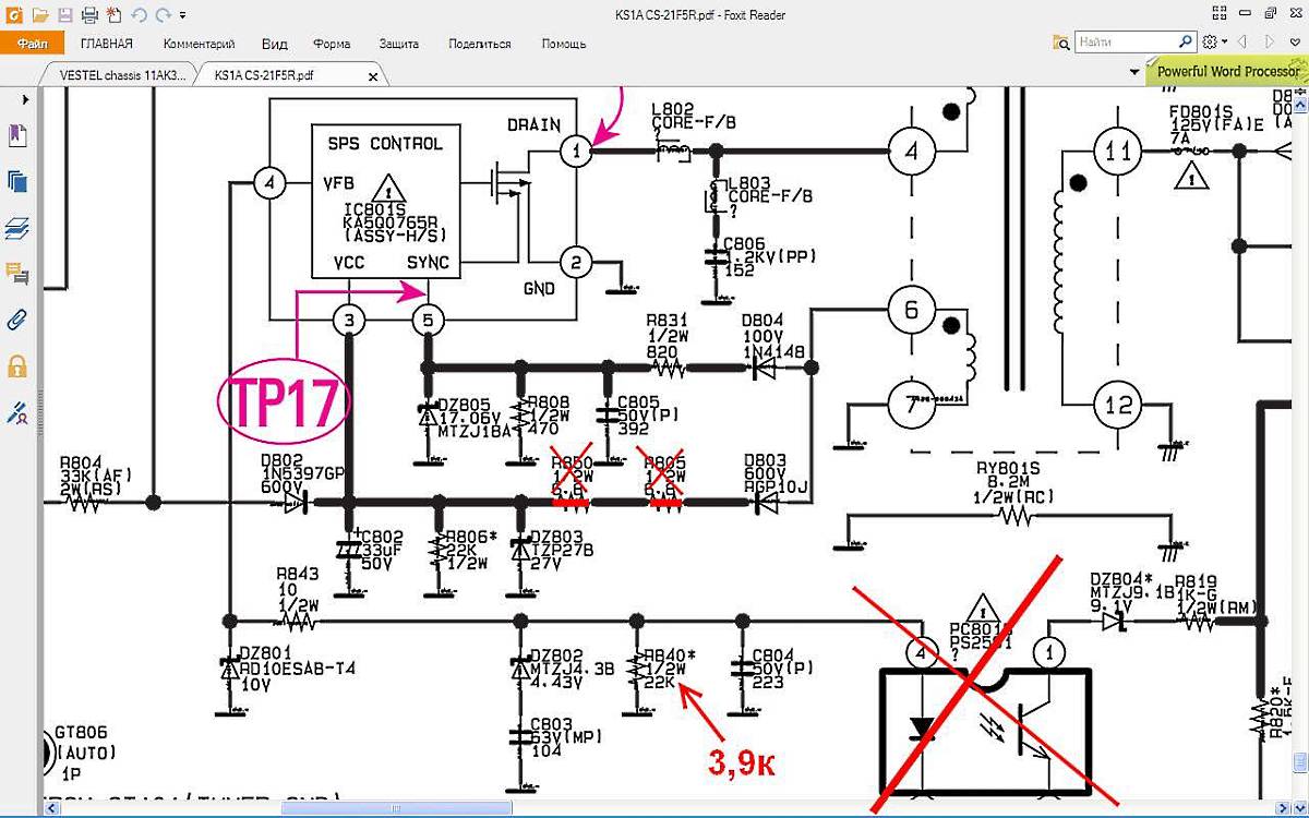 Проверка элементов вокруг 4 ноги KA5Q0765R показала, что все установлено, кроме оптопары (холодную сторону не смотрел) и изменен номинал R840 с 22к на 3,9к. Резисторы R805 и R850 заменены перемычками. DZ803 на 33 вольта. (1N4752)