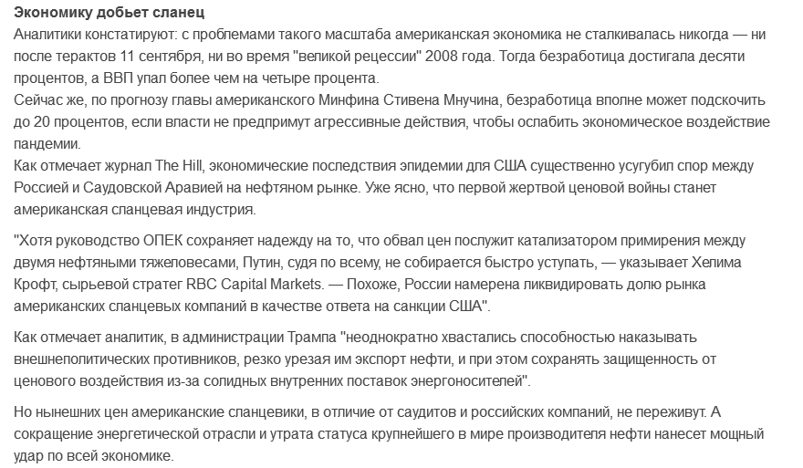 Нефть торгуется в минусе. Ура - бензин будет копейку стоить... А если серьезно: слесарь, допустивший ошибку и прорыв трубы отвечает рублем, телемастер бесплатно устраняет по гарантийке свой ляп. А вот с БОЛЬШИХ министров ответит кто-то, что мы за 30 лет так и не стали готовы жить без продажи нефти-газа. Иногда смеемся над соседями, а вот если представить нефть и газ на торгах в минусе и надолго ![]() |