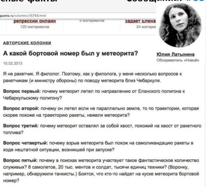 | Цитата: | Журналистка Юлия Латынина извинилась за свою колонку «А какой бортовой номер был у метеорита?», в которой предположила, что над Челябинском взорвался не метеорит, а ракета. С этого она начала свою еженедельную авторскую программу на радио «Эхо Москвы» в субботу, 16 февраля.