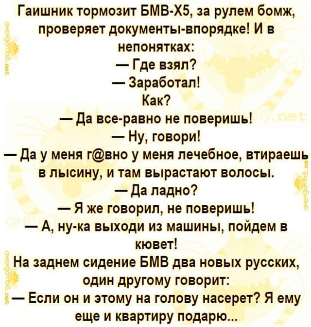 - Да не не, Андрюха, я не за деньгами, понимаеш, тут такая штука, мой денщик, мои сапоги снес в починку, а завтра бал, и только у тебя мой размер, а я хочу Наташе Ростовой сделать предложение. Ну, сам понимаеш, в лаптях, я это ну никак. Волконский: -Ржевский, да пошел ты,,, тебе, что дай, что выкинь, а они у меня одни на всю жизнь, а ты разпи..дяй еще тот, свои же загубил... Ржевский: -Андрюха, умоляю, дай, решается моя судьба, за Наташей хорошее приданое дают, я верну все долги, с тобой рассчитаюсь... Волконский: -ну смотри сука, ..уй с тобой, сапоги то я дам, но если хотябы царапина на них будет, тебе пи..дец. - Андрюха, клянусь, буду беречь их, как зеницу ока. Пришел порутчик домой, бросил сапоги денщику. Так, сука, чтобы начистил их до блеска, должны блестеть, как собачьи яйца, понял! Слуга все понял буквально и сделал всё с пристрастием, да так, что в них можна было реально брится, как в зеркале. И вот время наступления бала. Ржевский одел свой новый мундир, завязал лапти. А сапоги под мышку и огородами пошел в имение Ростовых, на бал. При входе переобулся в сапоги, рукавом полирнул их, глянул в зеркало, ну какой щеголь, айда Ржевский, айда сукин сын и решительно вошел в зал. Дамы все заохали, завздыхали. И тут обьявляют мазурку. Ржевский приглашает Наташу. Танцуют. Порутчик в голове обдумывает план, как лучше и наверняка сделать предложение, и случайно опускает глаза вниз, полюбоваться на сапоги, и с ужасом задыхаясь отскакивает назад, хватается за сердце. Наташа: -порутчик, да, что с вами? Ржевский: -Наташа, вы в трусах?! Наташа: -нет! Ржевский дрожащим голосом, продолжая держатся за сердце: -уфуфух, померещелось, подумал пи..дец,