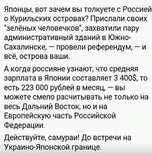 Для совсем упоротых добавлю, что длятого, чтобы Курилы устроили референдум, они должны быть автономией и в Москве в это время должен состояться нелигитимный захват власти. Что касается зарплаты в Японии, то вы цены там видели? Япония одна из самых дорогих стран. Хотя с вашим уровнем развития вам арифметика недоступна |
