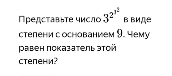 Borek, по-моему задача записана математически неправильно. Правильно будет не четыре этажа степеней городить, а использовать скобки, тогда показатели перемножаются. А в таком написании, как нарисовано все этажи последовательно вычисляются, в итоге получается вроде 3 в 512 степени или 9 в 511