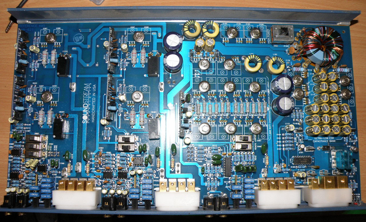 У меня был в ремонте аналогичный, тоже два таких модуля вентиляторами. Мосфеты менял, в одном плече - пробило пару штук. Соглашусь, в ремонте очень удобно - свободный доступ ко всем деталям. Силовые транзисторы меняются вообще без проблем - открутил поддон на днище и после этого свободен доступ ко всем выходным транзисторам. Откручиваешь винт крепления транзистора к радиатору и легко выпаиваешь его. В быту использовать такую технику.. ну его нах - вентиляторы шумят. Да и не нужно такой мощи никогда. К тому же к нему нужен предусилитель.
