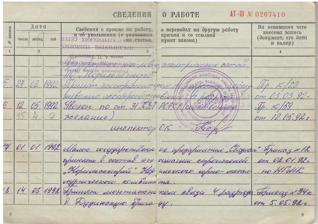 | "И носило меня!" Пошёл и взял.....Меня не носило по СССРу....Весь стаж в одном городе, не считая СА...Два рабочих места за 50т. лет стажу... |
