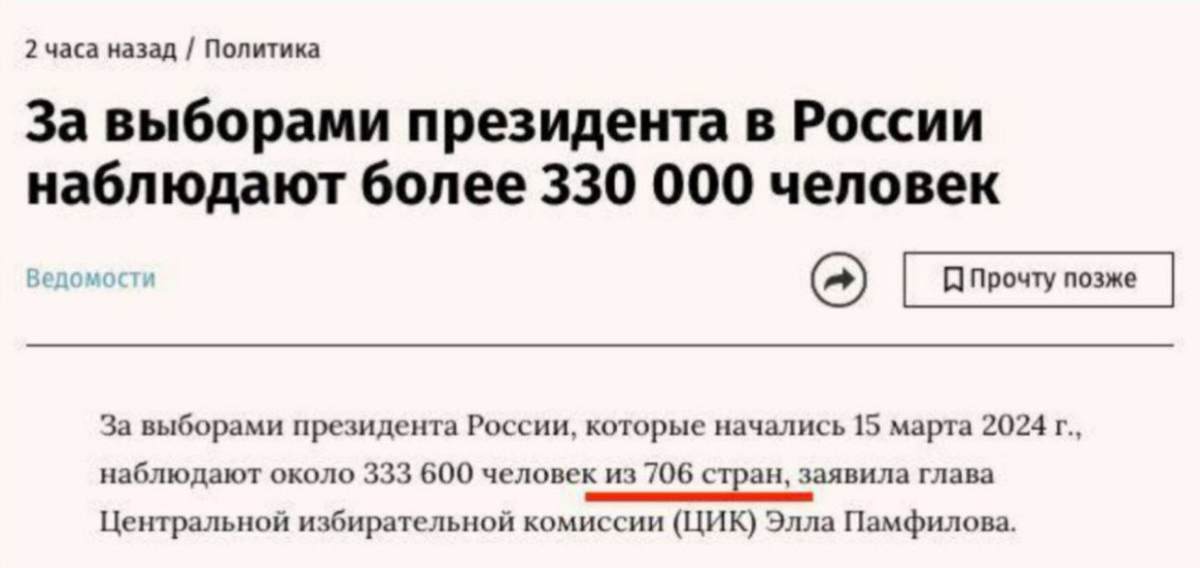 Пока проклятые либералы врут о международной изоляции россии, за переизбранием путина приехали наблюдать из 706 стран.