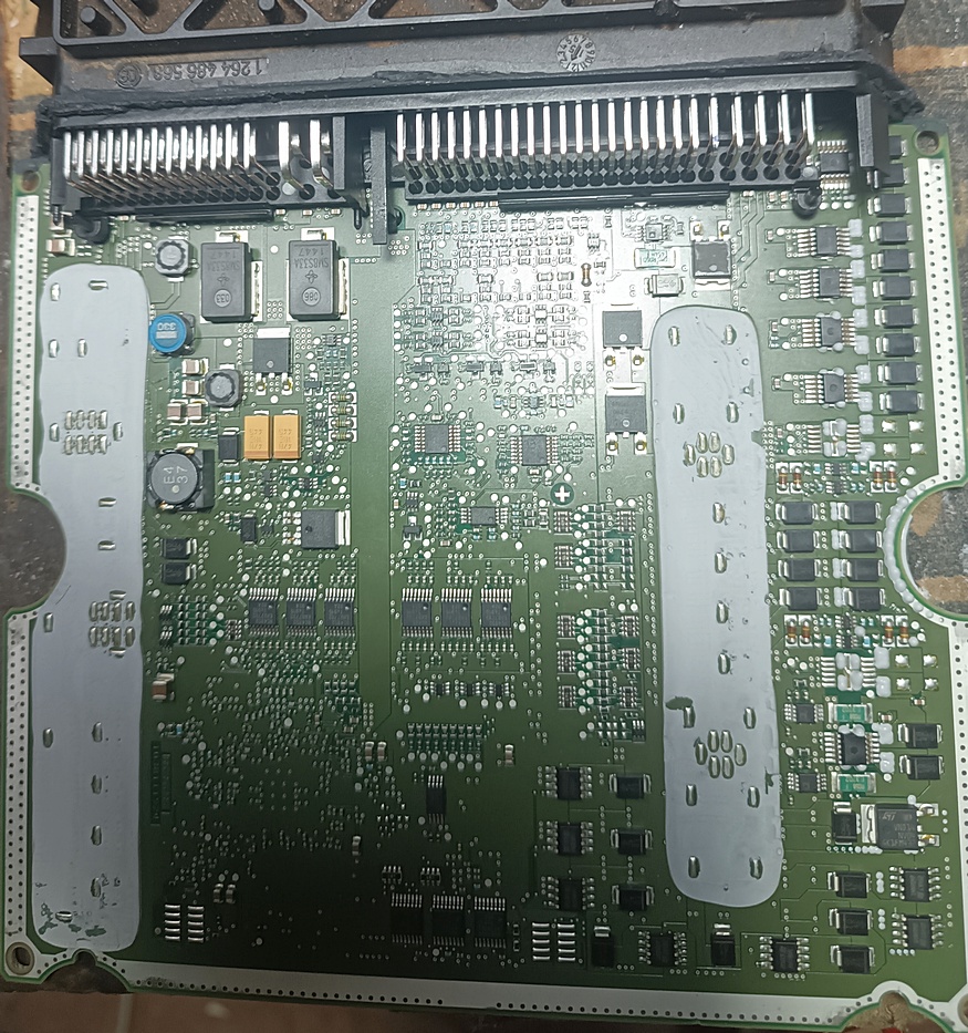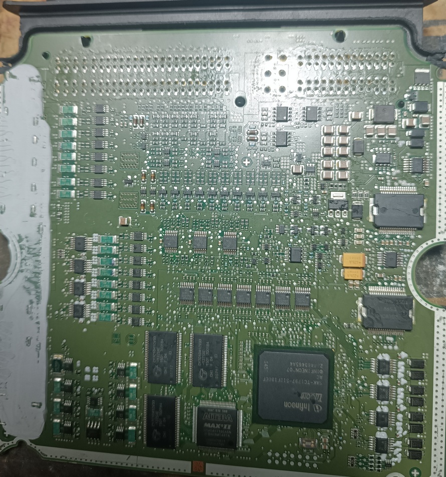 Обратились мне, с автомобильным блоком от экскаватора. В ремонт его сдавали, следов ремонта нет. Проработал немного и сдох. Детальный осмотр выявил нарушенный кварцевый резонатор микроконтроллера. Со слов хозяев, следов крышки резонатора нет.