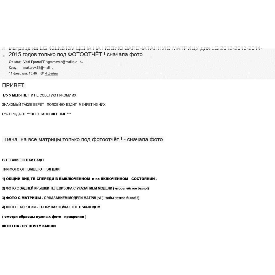 На прошлой неделе обратился к данному продавану за матрицей, сообщение было таким - на такой то телевизор нужна матрица, скажите какова цена на новую и на б/у, в итоге получил такое сообщение (скрин1) на три страницы :-)