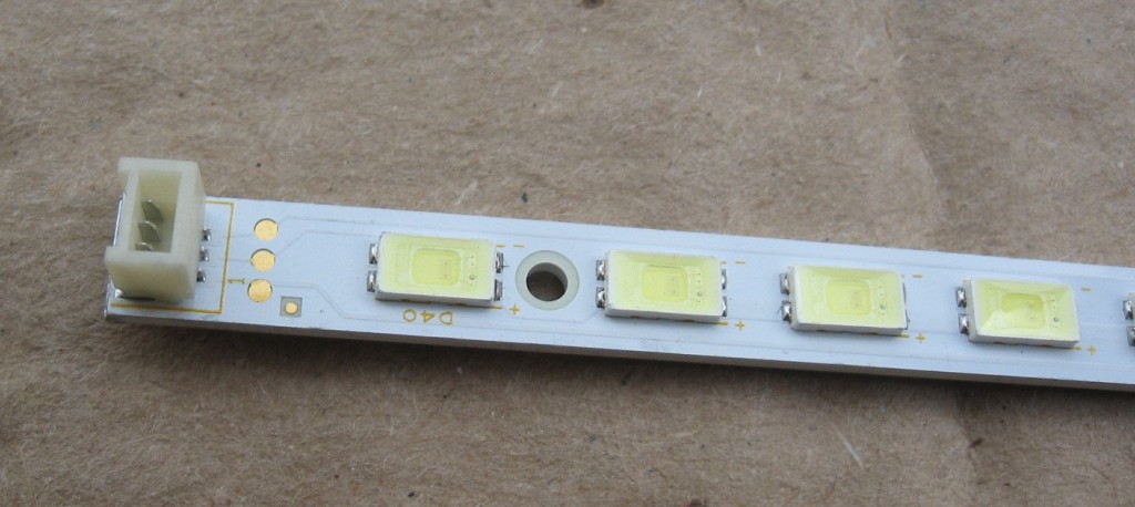 40 светодиодов,алюминевая основа, включение 20х2.Длинна 362мм ширина 6мм.Разъем 3 контакта торцом.