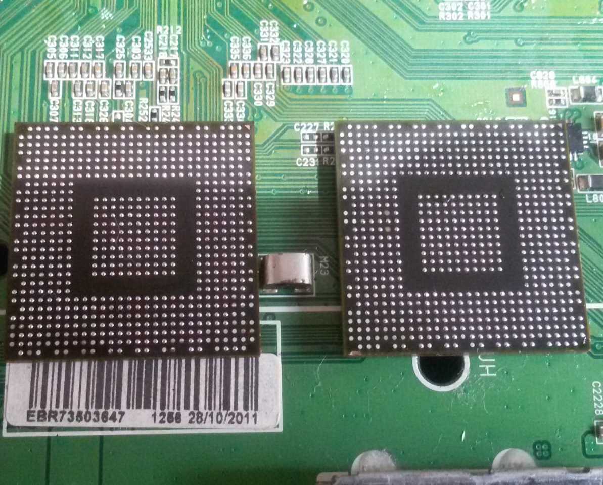 Родной процессор раз восстанавливали нагревом, что вернуло цветность в норму на пару месяцев. На другой раз решил заменить процессор на новый - купил его у китайца с накатанными шарами. Шары сдул для перекатки свинцовым припоем, но тут мне попалась новая плата более современная (цена в Москве 15000 р.), и работа была остановлена по ремонту. Процессор не стал запаивать, продам как есть вместе со старым процессором. Телевизор лежит разобранный, ждет посылку с новой материнкой. Любые фото сделаю, всё реально моё, не из интернета. Отдаю комплектом плату+новый процессор (старый проц в подарок тоже). Покупка без возврата так как вещь не новая, доставка за ваш счет.