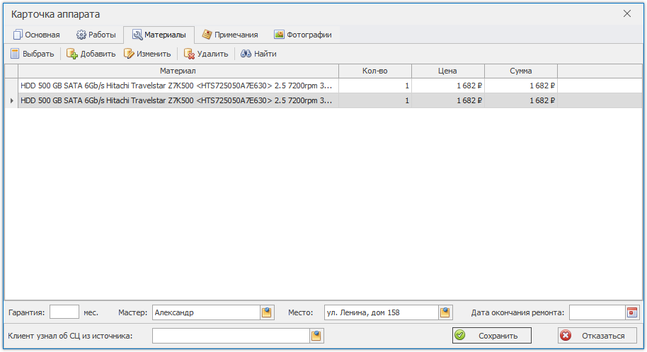 Предназначена для ведения учета выполненных работ, затраченных материалов, принятых на ремонт аппаратов в сервисном центре.