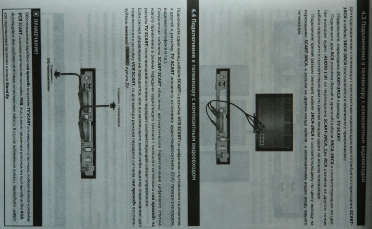 Не проще купить два шнура (только нормального качества, а не самое дешёвое китайское г.. за 1$) скарт-скарт и тюльпан-тюльпан (стерео если нужно), и на всяк случай ещё скарт-тюльпан, если не хотите три года соединять ТВ и саттюнер.Если денег на шнуры жалко, то не понадобившиеся шнуры можно сдать назад в магаз течении 14 дней по закону, если не будете снимать упаковку. |