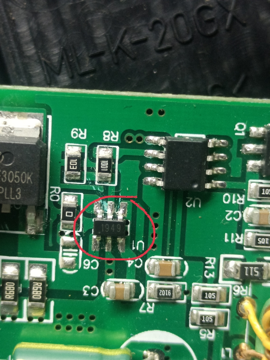 Доброго времени суток. Есть такой вопрос необходимо распознать элемент схемы, похоже что это может быть либо транзистор, либо транзисторная сборка, управляющая в свою очередь силовым транзистором. Плата из аккумуляторного прожектора. Заранее большое спасибо.