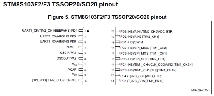 Теперь заморочился определением микроконтроллера. По распиновки выводов он очень он похож на STM8L103 заисключением вывода 8. По даташиту он VCAP, а в моем устройстве он является портом вывода. Пересмотрел кучу всяких STMов, но других вариантов не нашел. На моем устройстве выводы имеют следующие значения: