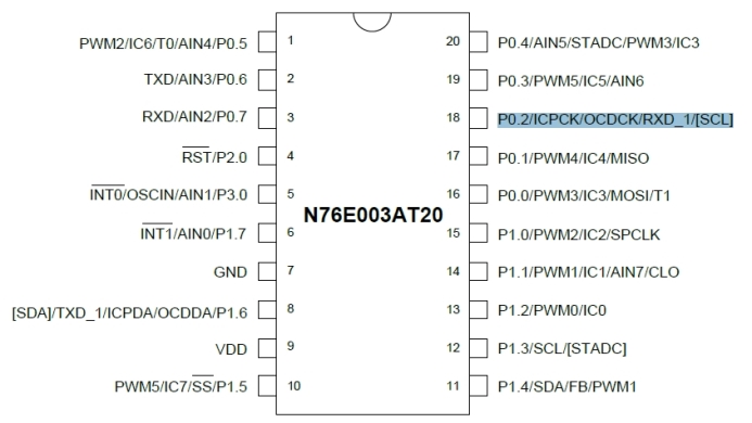 Если предположить, что это N76E003AT20, то его 18й контакт идущий на сервисный разъем получается имеет такие назначения "P0.2/ICPCK/OCDCK/RXD_1/[SCL]" и зачем их выводить на сервисный разъем без дополнительных выводов мне не понятно.