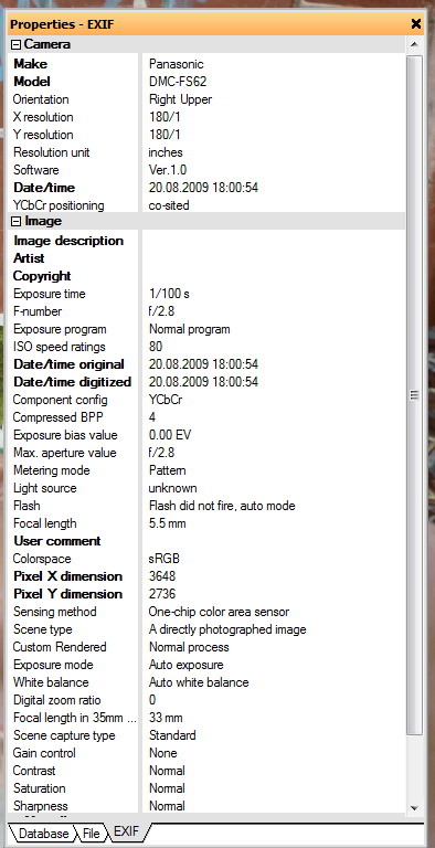 makeym, метаданные это называется (metadata), делятся на две категории - EXIF и IPTC. К сожалению, данные IPTC установленная у меня ACD See 7.0 не показывает, данные же EXIF, включающие в себя полностью данные фотоаппарата, в том числе даже версию программного обеспечения камеры, режимы съёмки, в том числе автоматически выставленные аппаратом (те же что у тебя), дату съёмки, дату оцифровки, и ещё дофига всякой хрени, подтверждающей подлинность и авторство данного снимка и справочные данные (фокусное расстояние, выдержка, светочувствительность, диафрагма, цветовой режим, и т.д, и т.п), понятные в основном фотографам, работавшим на неавтоматических камерах, выглядят примерно так (к сожалению, полностью не вошло):