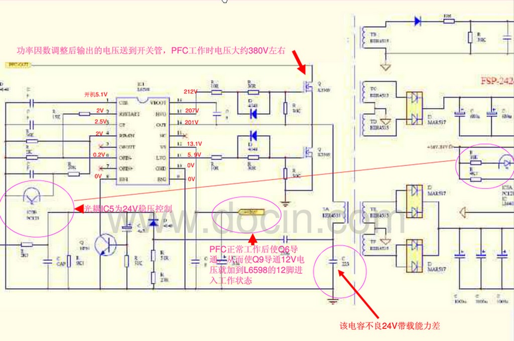У моего знакомого автослесаря, что ремонтировал мне авто, полетел телик..LG42LV3551. С его слов, безперебойник пошел " в разнос"(?) и спалил телик..Я попросил его принести его, мол. посмотрю..в итоге получилось следующее, вылетела шимка (fan 7930) напряжение питания поднялось за 600 вольт и последствия конечно ужасные. Почему не сгорел предохраниетль как "закипела" 1 из банок емкости, мне не понятно, Он сгорел позже, когда я его вкл....Все удалось восстановить, кроме как инвертор подсветки (L6599D)/ дело в том что мало того что ее разорвало на шматье, так под ней был прогар величиной после зачистки с советский железный рубль..схему частичную я нашел на него,(прикладываю) , собрал все на "навесной" плате и посадил ее на "паук", но не стартует подсветка ни как и соответственно не вкл. весь телик..все дело в том что по схеме не ясны номиналы емкостей.. некоторые резюки не отмечены..так же не понятен номинал транзистора Q103/. напряжения питания..прекондей 385v. 12 нога L6599-13v 7нога 1.66 +_.Читал что с прекондея через делитель должно быть порядка 1.6 вольт. иначе микруха уходит в "сон". при питании прекондея 320 вольт на 7 ноге всего 1.2 вольта, это я к тому что тут на форуме писали про 320 вольт прекондея.. в общем не судите строго, но мне помощь нужна в большей части номиналы емкостей.. осцем пока не работал,