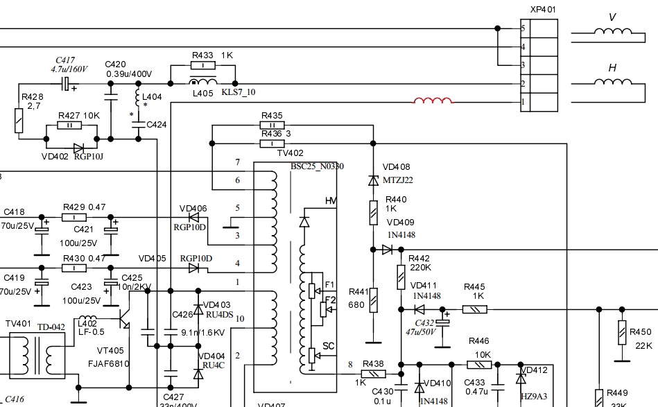 | Цитата: | | ...размещение на магнитопроводе ТДКС дополнительной обмотки, состоящей из 10...60 витков провода МГТФ и включение ее последовательно между первичной обмоткой ТДКС и СОК (т.е. включение по автотрансформаторной схеме - обмотка подключается одним выводом к коллектору НОТ, а вторым - к цепи элементов, которые раньше подключались к НОТ, что и сделано в большинстве «китайских» ТВ с ТДКС, имеющими дополнительные отводы первичной обмотки для установки размеров растра). Число витков и фазировка указанной дополнительной обмотки подбирается экспериментально до получения требуемого размера по горизонтали... |