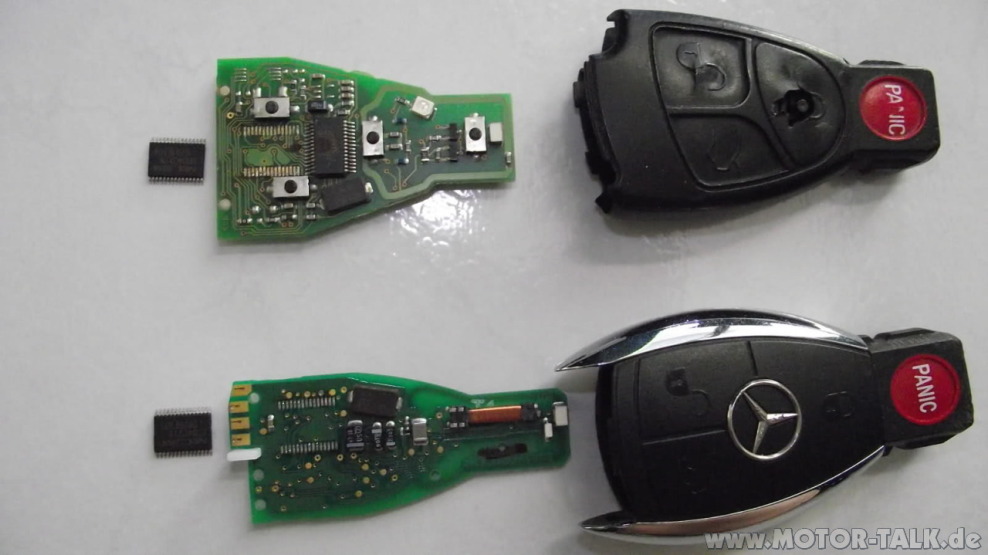Вопрос такой.На фото (из интернета) 2 ключа от данной машины,у меня имеются 2 таких-же.Хочется хромированный ключ-"приучить" к моей машине(у меня просто чёрный).На Мерседесе сказали,что б.у.ключ-не перепрограмируется,ну или очень дорого и хлопотно.Вычитал на немецком форуме,что надо просто перепаять 30-ножку (не знаю как называется эта приблуда-чайник я)-смотрим фото!!! с моего ключа,в другой ключ и он будет работать.Хотелось-бы узнать ваше мнение.p.s.Ключа своего,тоже не хочется,как-то лишатся из-за таких экспериментов.Спасибо.