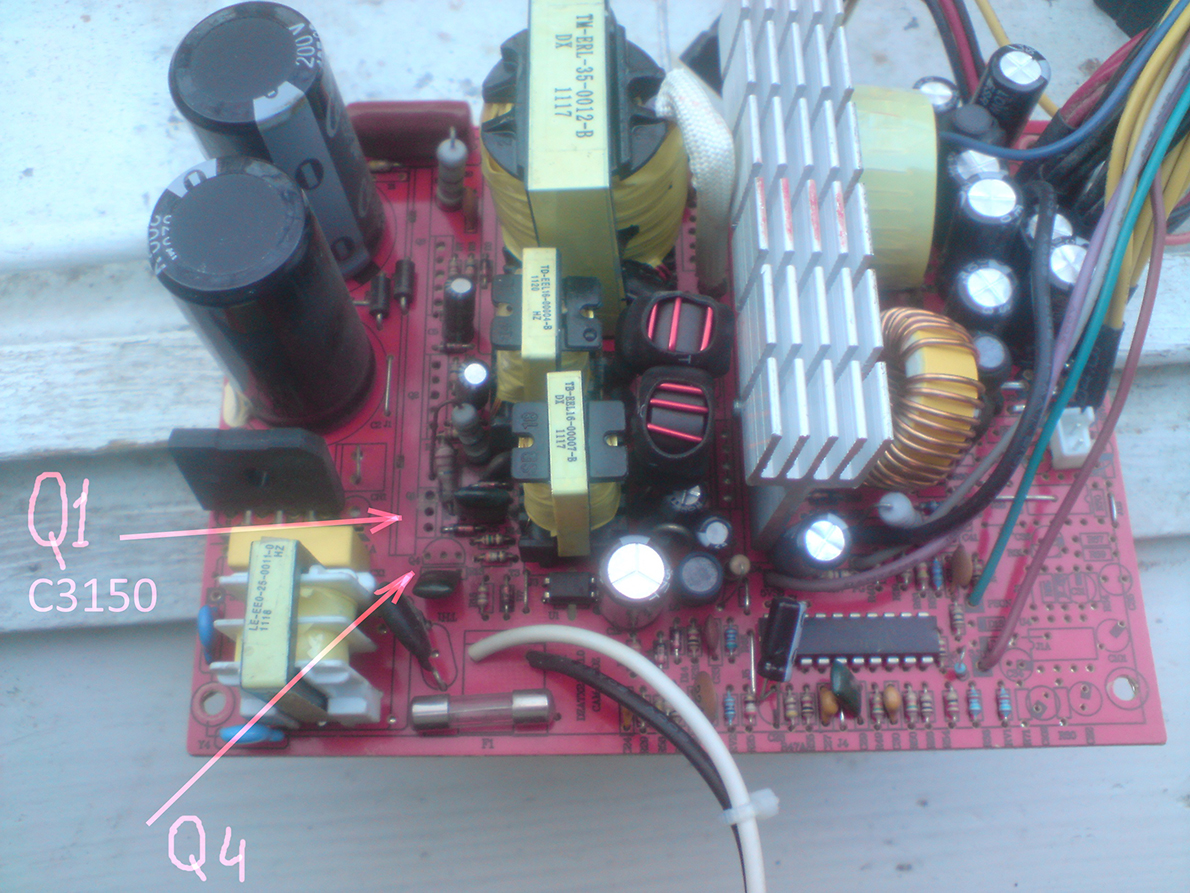 проблема та же сгорели два транзистора Q1 и Q4 один (большой) можно определить половина надписи сохранилась С3150 наверное а маленький рядом только последние цифры 331 и все