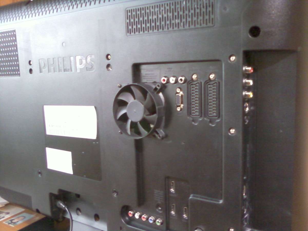 После 10 мин. нормальной работы на изображении появляются горизонтальные и вертикальные полоски (фото 1) с резким потемнением картинки и появлением вертикальных полос (фото 2). Радиатор скалера PN5100EH нагревался до 70 град.. При повторных включениях, после полного остывания, дефект повторялся. Принудительное охлаждение радиатора с помощью кулера позволило исключить дефект (фото 3). Питание кулера - от разъема на PSU-CN8, конт. Fan PWM(+24V) через ИМС стаб. 7812. Электропрогон 3 дня по 5 часов без проявления дефекта.