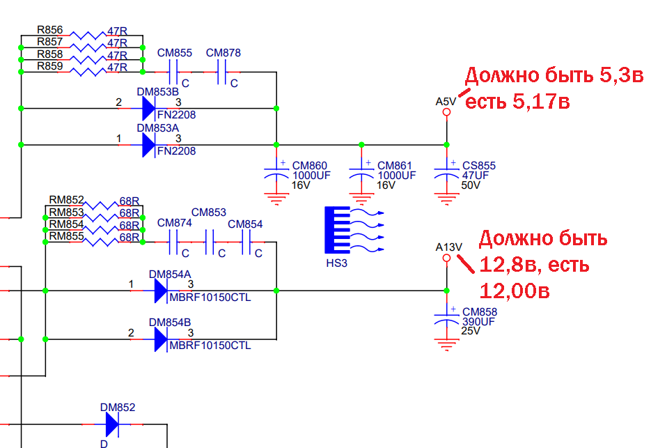 Т.е. если растёт потребление тока по выходу питания подсветки ( при регулировке с пульта ), то нагрузка на транс растёт, цепь А5V просаживается, ШИМ начинает вкачивать в транс больше энергии. Другие питающие напряжения взяты от этого транса подрастают. При подрастании этих напряжений, дефект усиливается.