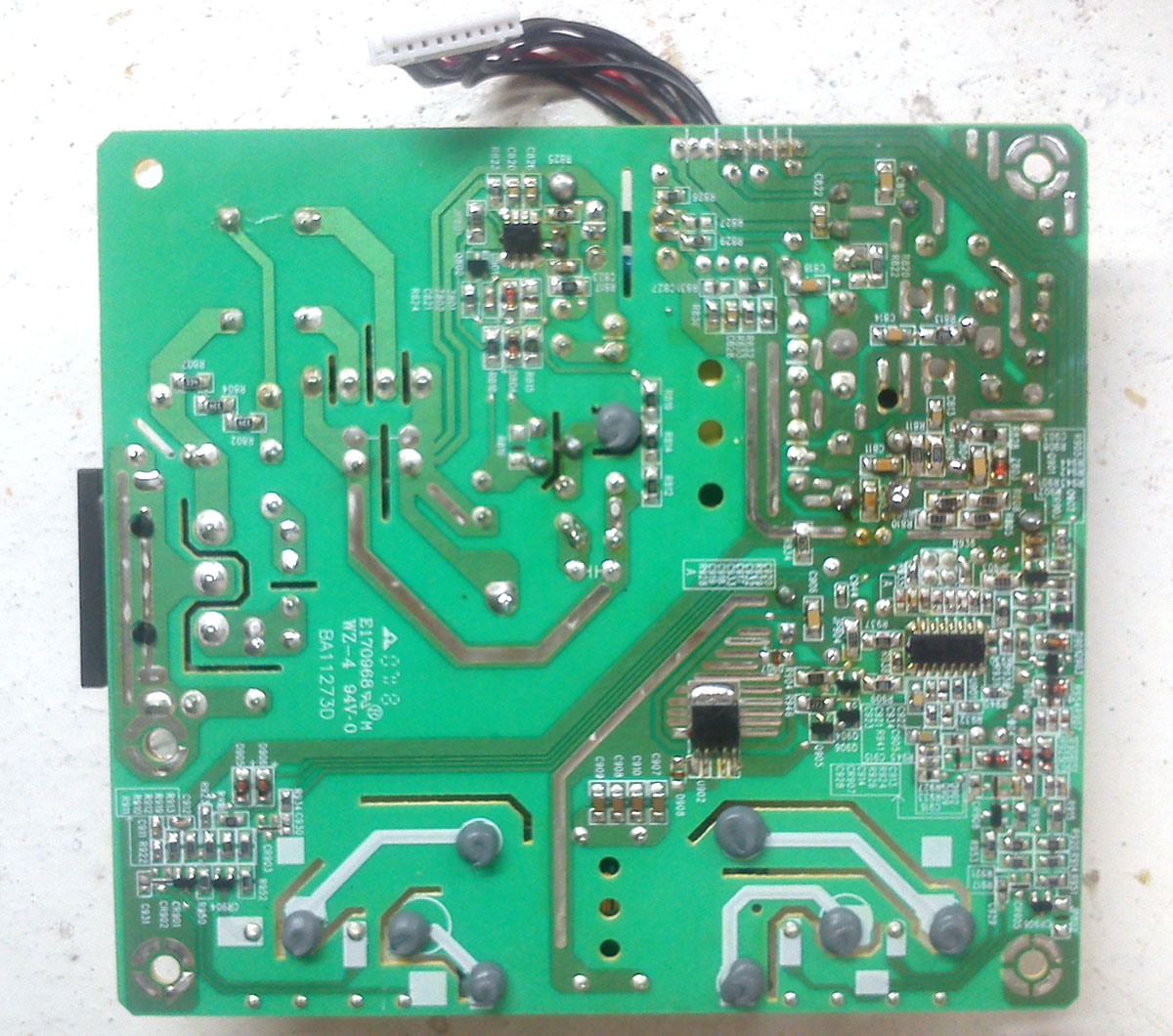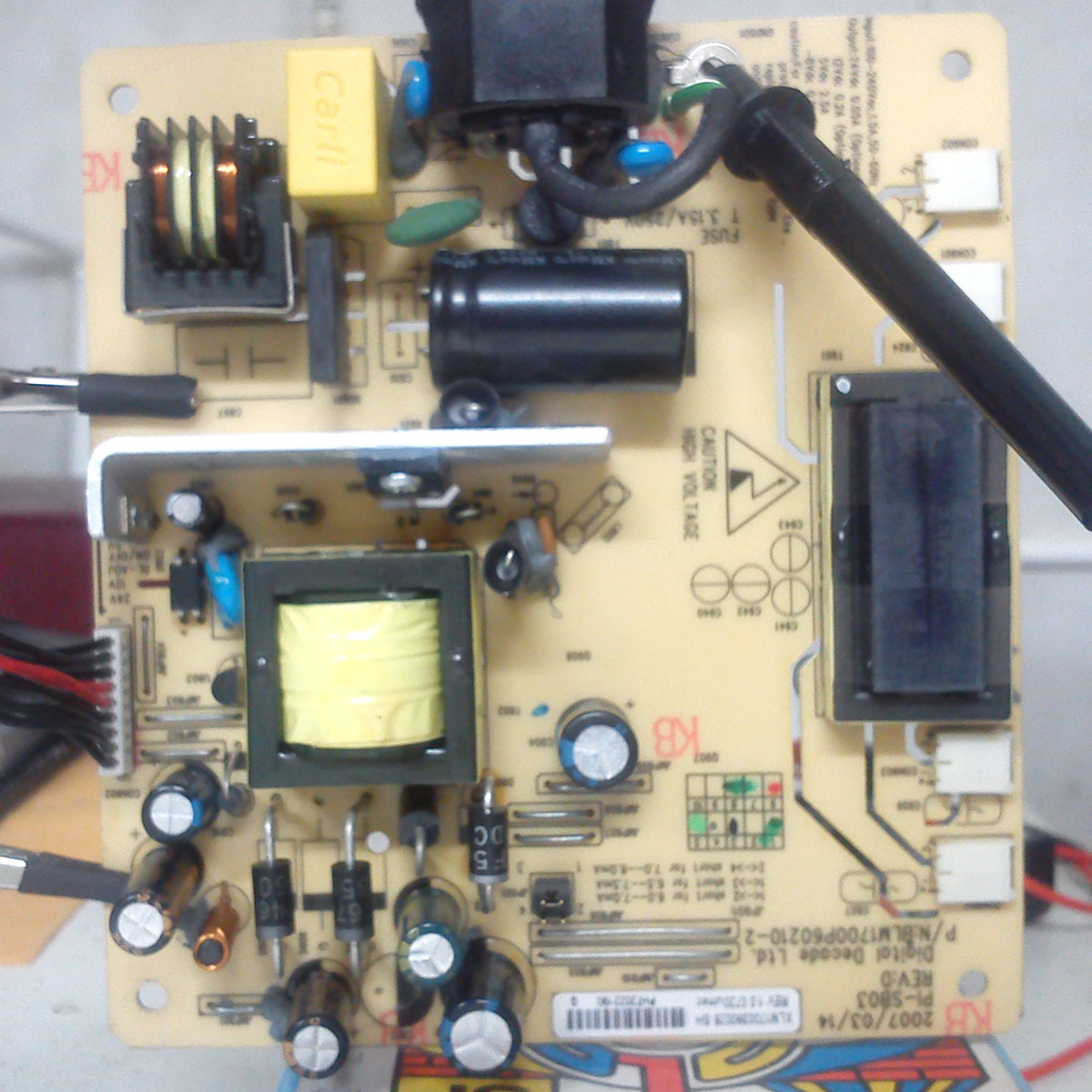 Признаков жизни никаких. Как сломался неизвестно. Питание на выходе по нулям. Что с нагрузкой, что без нее. Опыт ремонта мониторов заключался в замене конденсаторов, полевых транзисторов... Но здесь этот трюк не удался. Заменил конденсаторы (С904, С802, С812, С829, С819, С816) на аналогичные по параметрам. Только один (С824) поставил вместо 10 mf 50V – 10mf 63V. Далее поменял полевой транзистор К2645 на такой же новый. Поменял оптрон 817с тоже новый поставил. Диод (D801) SF50GG не прозванивался в обе стороны заменил на SF56 (другого не нашел). Остальные диоды вроде в норме. Но все усилия тщетны – на выходе нуль.