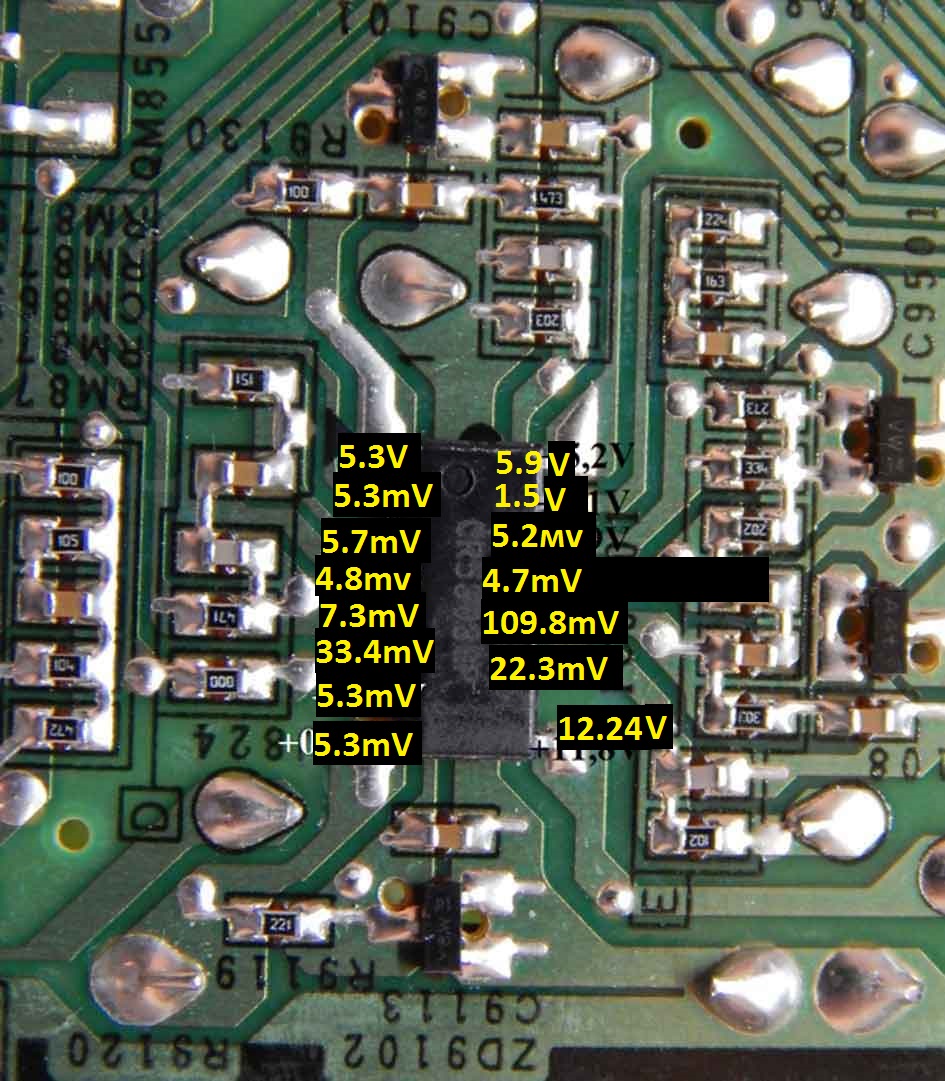 Смотрел телевизор. Пропало изображение, но звук был. Выключил. Включил, моргает красный огонек и не включается. Вскрыл осмотрел платы. Видимых дефектов не нашел. В выше приведенной ссылке Были обозначены точки замеров напряжений. Замерив, нашел не соответствия. приведу ниже картинки с моими значениями(желтые).