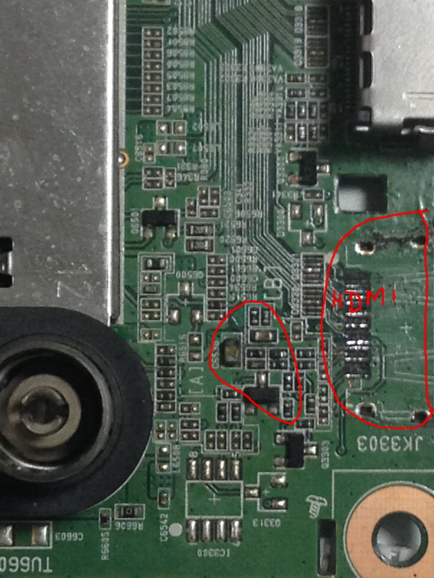Принесли с такой проблемой, выломали разъем HDMI, он провалился упал на плату управления, результат - не включается. Дежурка горит, с БП все напряжения в норме (3,5 В; 12 В; 24 В), при нажатии на кнопку включения, 3 раза мигает индикатор и тишина... Повреждений элементов визуально нет, есть лишь в местах падения разъема на плату пригорелость на конденсаторе, прикладываю фото ниже (обведены место где был разъем и место куда он упал). Может ли дело быть в прошивке или с чего начинать копать?