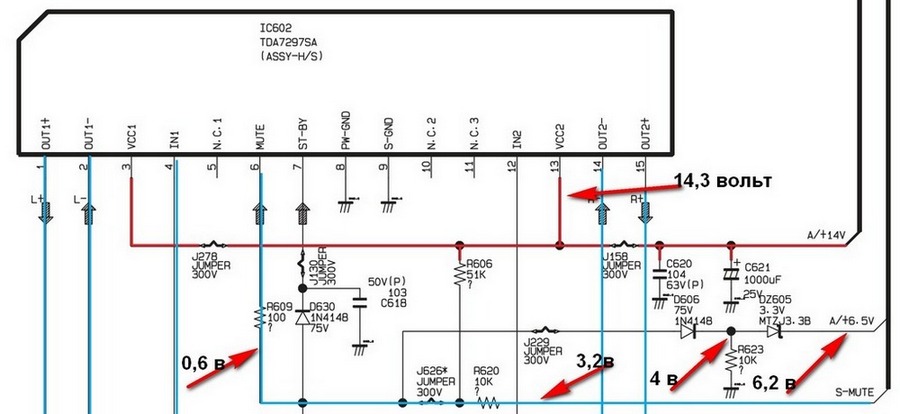 Тв Samsung CS-21Z30ZQQ шасси S16C процессор TDA12025PQ/N1F80 память - atmel 24C16A звук - TDA7297SA Изначально по контуру изображение периодически секло и как бы тянулось.Сразу обнаружил вздутый конденсатор С410.Замена на изображение не повлияла.Проверил электролиты блока питания, конденсатор с815 показывал утечку, -поменял, изображение стало чистым.А вот со звуком не могу разобраться. Микросхемы TDA7297SA ,что бы подкинуть нет,нужно выписывать.С процессора по цепи mute напряжение 2,7 вольт. В цепи 6,5 вольт обнаружил замкнутый диод d606, поменял,звука нет. На входе усилителя звук присутствует и регулируется. Полазив по форумам,решил поменять память 24C16, звук не появился,а в настройка вместо надписи шумоподавление - какие то "крякозябры". Слепил на скорую руку crd программатор,скачал прошивку.Программатор шить отказался (вроде бы как визуально пишет,а в итоге никаких изменений),но зато прошивку считывает. Сравнил я скачанную прошивку с родной от телевизора - одинаковые, в той что покупал есть отличия.Попробовал на mute и st-by TDA7297SA отдельно подать 4,5 вольт - звук не появился.К стати розвязав цепи mute и st-by от схемы,на процессоре на 11 ноге ( mute) напряжение поднялось до 3,1 вольт и на d606 - 4вольта.Может кто подскажет,какое сопротивление на 6 и 7 ноге TDA7297SA относительно земли?