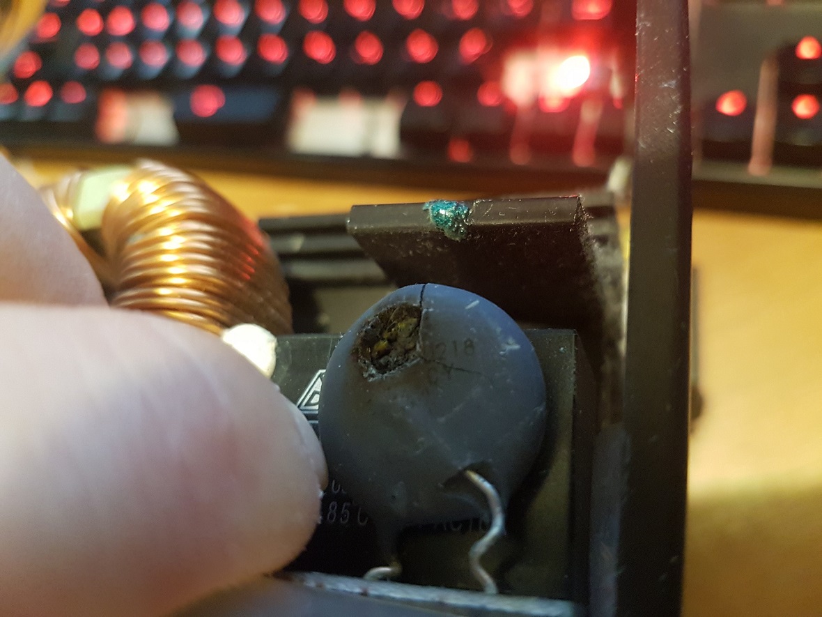 Блин, если это по итогу оказался термистор - менять его на похожий, какие стоят в других БП и всё. Я изначально подозревал, да схемы не было, а на вторую фотку не смотрел внимательно, там и правда виднО обозначение...