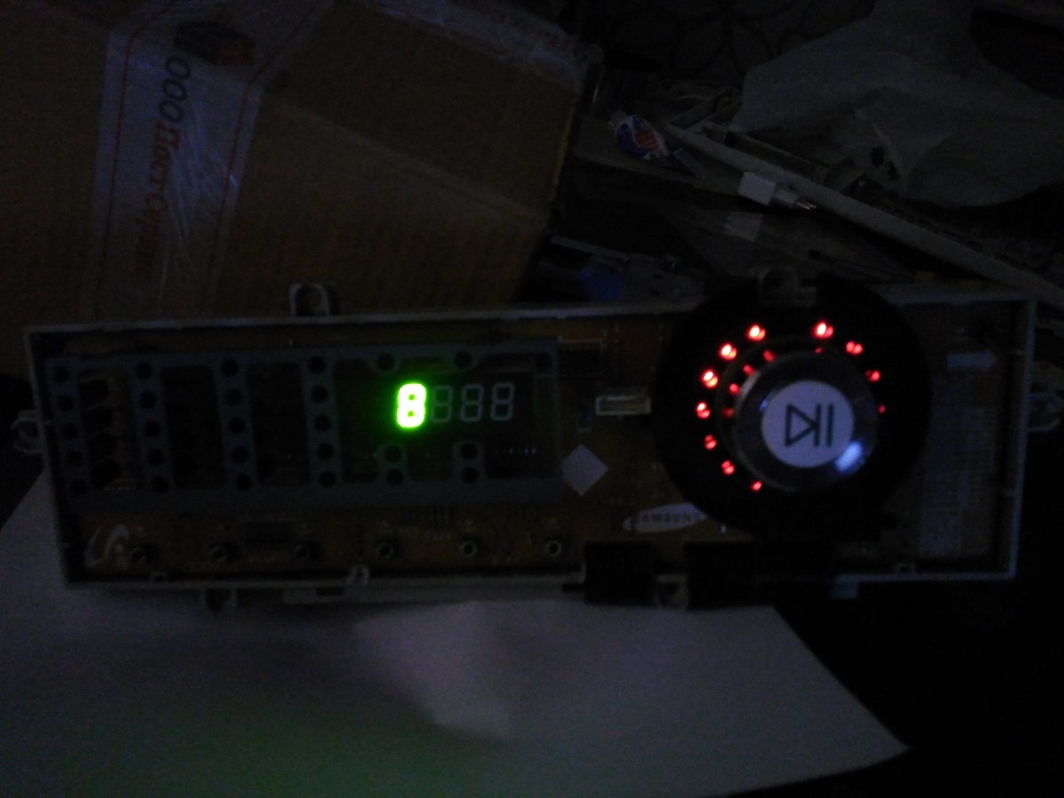 Все было заменено, однако после включения картина повторилась: горит цифра 8 на табло и горят все светодиоды вокруг колеса выбора программы. Кто знает подскажите пожалуйста в чем еще может быть проблема??