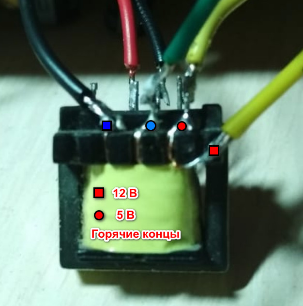 Запомните какие выводы транса АТХ куда были подключены - это важно, схема обратноходовая. Две вторички имеют общий минус (три провода вместе на одной ноге), поэтому отпаяйте и осторожно отмотайте провода от ножки. Прозвоните и пару пятивольтовых верните обратно на ножку, а оставшийся - это от 12В линии. Теперь правильно соедините транс с платой. Тот конец 12В обмотки, что был соединён с 5В-ой будет "горячим", соответственно, второй её конец садим на массу. Подключение пятивольтной и первичной обмоток смотрите по плате АТХ блока и подключайте соответственно, чтоб не перепутать начало-конец.
