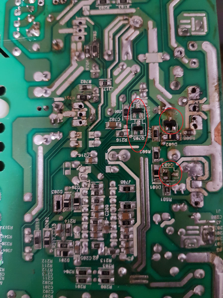 В моем случае разорвало микру дежурки TNY278, визуально было обнаружено уже вздутый 400v 390Uf, предположительно из-за него. Предохранитель цел, рядом стоящие 21n60n целые, u501, d501, zd501, t501 целые (t501 сопротивления 13,6/7,8/7,8 ом). НЕ проверял еще U702, U701 так как надо выпаивать. отгоревший по одной ноге R503, подгоревший R506, залитый герметиком D505 и ШИМ не проверял.