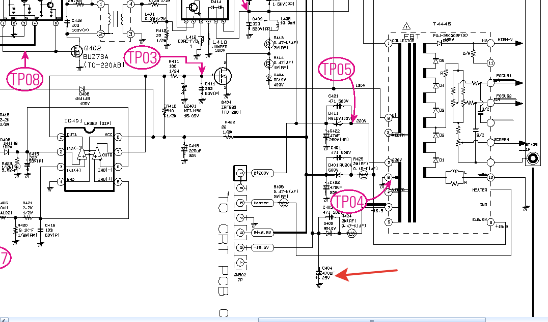 Можно мультиметром сделать замер напряжений на выводах LA7845, после - сделать пробную замену С404 . |