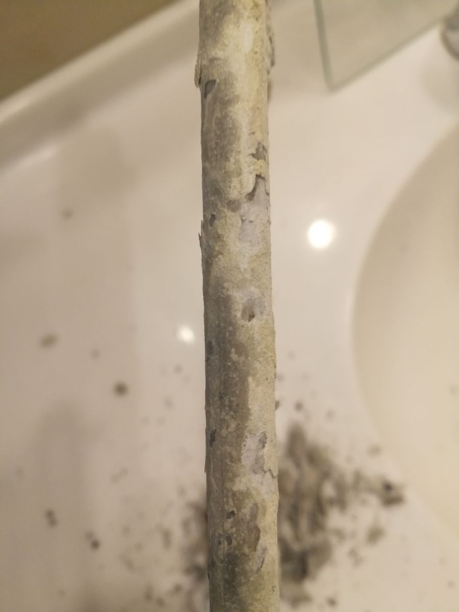 Через 2,5 года после покупки умер ТЭН на AEG 58405FL 60см, с функцией пара (не пользуемся). ФОто приложены. Но слой отложений мягкий, пористый, снимается на раз. Кроме того нижняя половина ТЭНа покрыта более белым налетом.