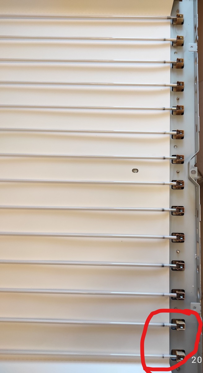 Потом заменил 13 шт. из 14-ти ламп подсветки, ставил б/у в очень приличном состоянии. При тестовом включении все лампы горят, телевизор не отключается. Одну лампу менять не стал - её пару лет назад заменял телемастер, визуально она в хорошем состоянии. Собрал - тёмная часть экрана, как на фото. Ещё смутило при замене ламп подсветки, что крайняя сверху экрана лампа по-моему, которую заменял телемастер, сориентирована(анод-катод) аналогично соседней (но горит!), а все остальные - чередуются. С матрицей обращался аккуратно вроде бы. Погуглил, похожей картинки не нашёл. Почему затемнение такое? Прошу помощи.