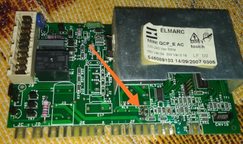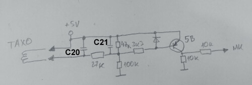 Попала вода в разъем двигателя. Тахо в обрыве. Заменил. Но осталась проблема в узле ТАХО на плате. Испарился конденсатор С20. В схеме журнала "Ремонт и сервис" номиналы смд конденсаторов не указаны. Схема узла чуть отличается от моей, но принцип тот же.