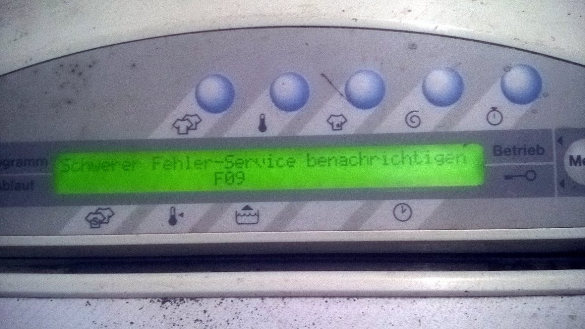Вытащил нижнью плату модуль, и выявил перегоревшие дорожки, кинул перемычку, подключил и дисплей заработал, и один из насосов начал сразу журжать и свистеть, отключил-включил питание снова, дисплей загорелся повторно, уже не помню что показывало, но вродебы какую то температуру и режим стирки, нажал на кнопку MENU и выбило ошибку F09 после чего кнопки перестали реагировать вообще)) ошибка F09 это что означает?
